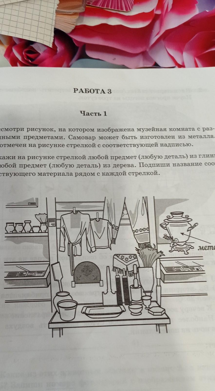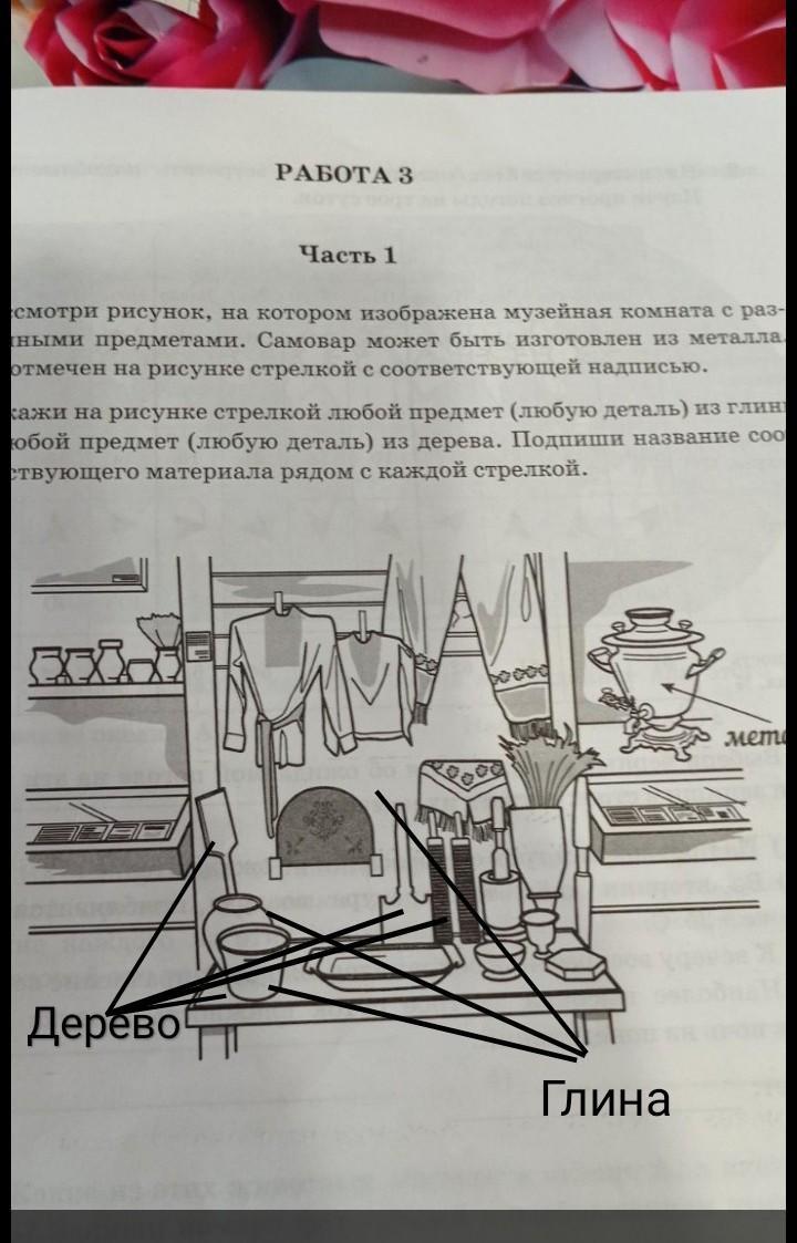 Рассмотри рисунок на котором изображена музейной комнаты с различными предметами самого Может быть изготовлен из металла он ответит на рисунке стрелкой соответствует надписью покажи на рисунке стрелкой любой предмет и будет из глины любой предмет любую деталь из дерева Подпиши названия соответствие материала рядом с каждой стрелкой