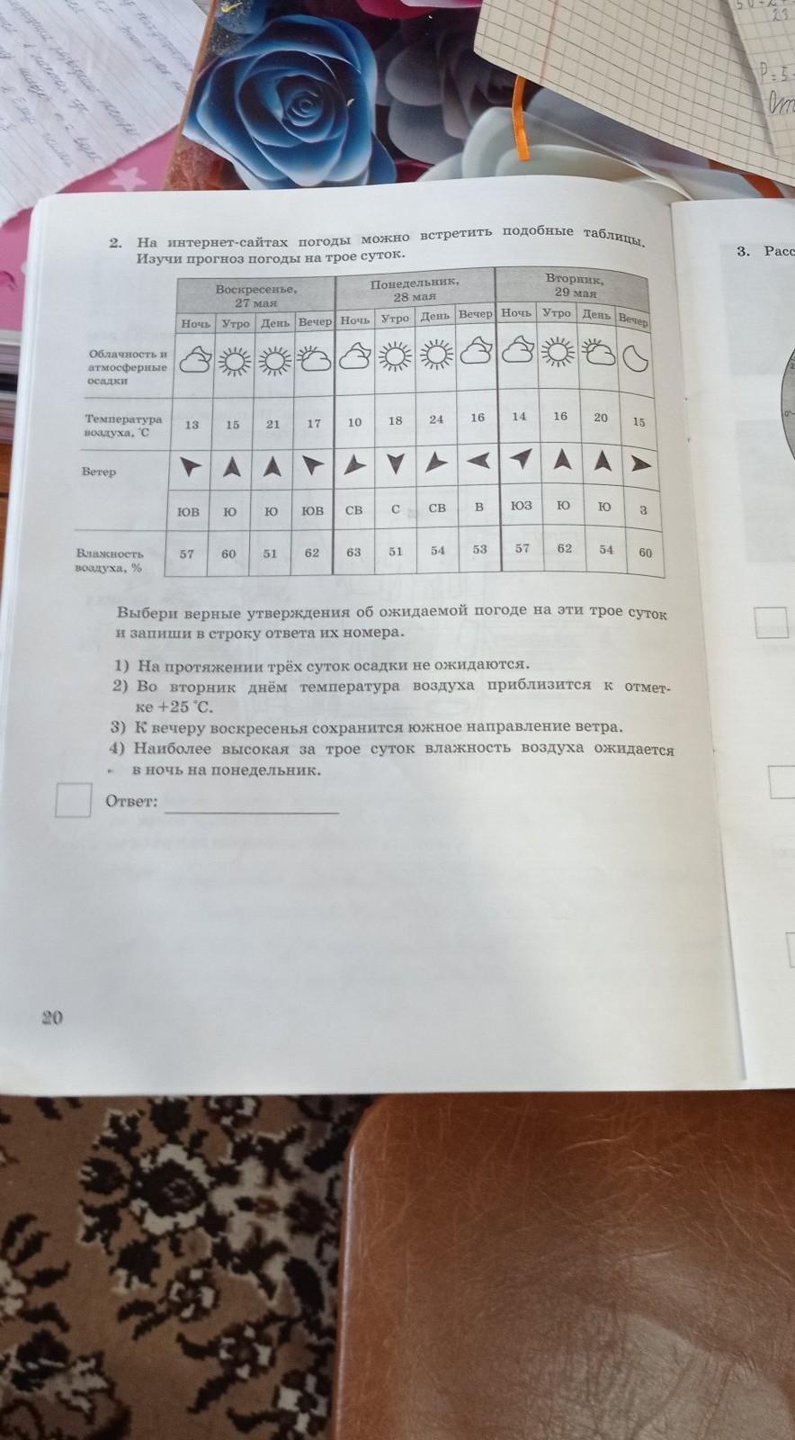 на интернет сайтах погоды можно встретить подобные таблицы Изучи прогноз погоды на трое суток Выбери верное утверждение об ожидаемой погоде на эти трое суток и запиши в строку ответа их номера на протяжении трёх суток осадки не ожидаются во вторник кроме температура воздуха по приблизится к отметке + 25 градусов к вечеру воскресенья сохранится южное направление ветра наиболее высокая за трое суток влажность воздуха ожидается в ночь на понедельник