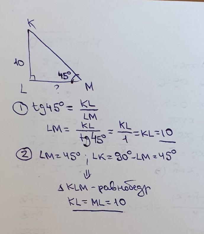 у прямокутному трикутнику KLM з гіпотенузою KM < M=45; KL=10 см. Знайдіть катет LM.