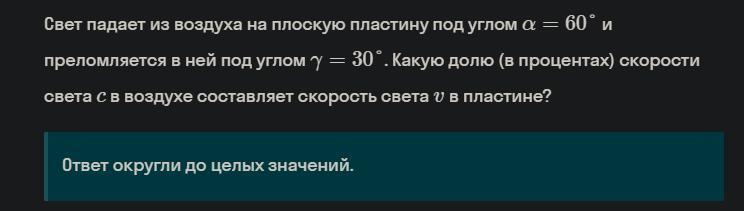 свет падает из воздуха на плоскую пластину под углом а=60 и преломляется в ней под углом 30.Какую долю(в процентах)скорости света с в воздухе составляет скорость света в пластине.