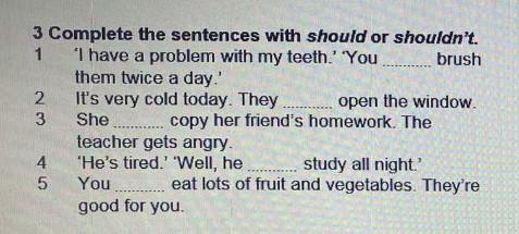 Ответ: 1-should 2-shouldn’t 3-shouldn’t 4-shouldn’t 5-should