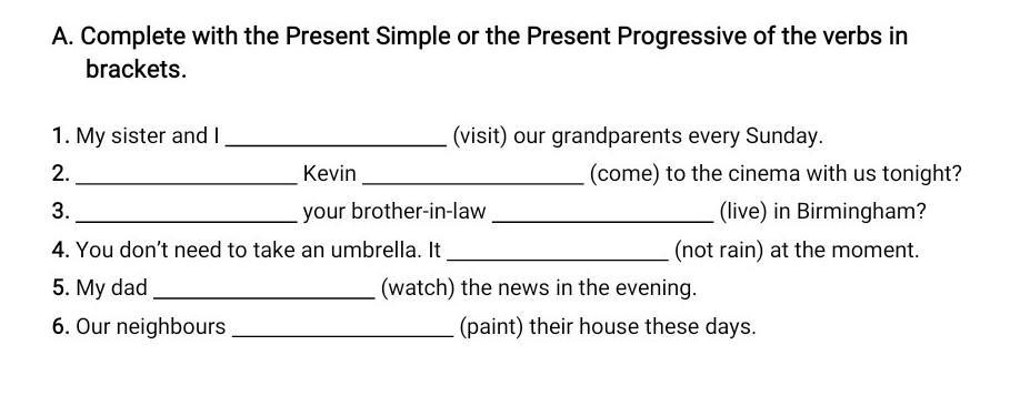 1) visit 2) does ; come 3) does ; live 4) is not raining 5) wathes 6) are painting