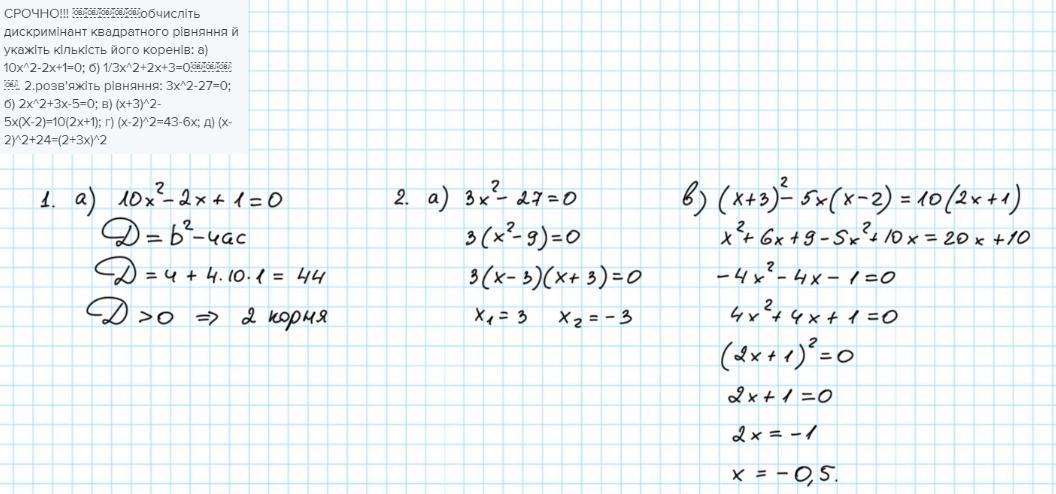 СРОЧНО!!! обчисліть дискримінант квадратного рівняння й укажіть кількість його коренів: а) 10х^2-2х+1=0; б) 1/3х^2+2х+3=0. 2.розв'яжіть рівняння: 3х^2-27=0; б) 2х^2+3х-5=0; в) (х+3)^2-5х(Х-2)=10(2х+1); г) (x-2)^2=43-6x; д) (x-2)^2+24=(2+3x)^2