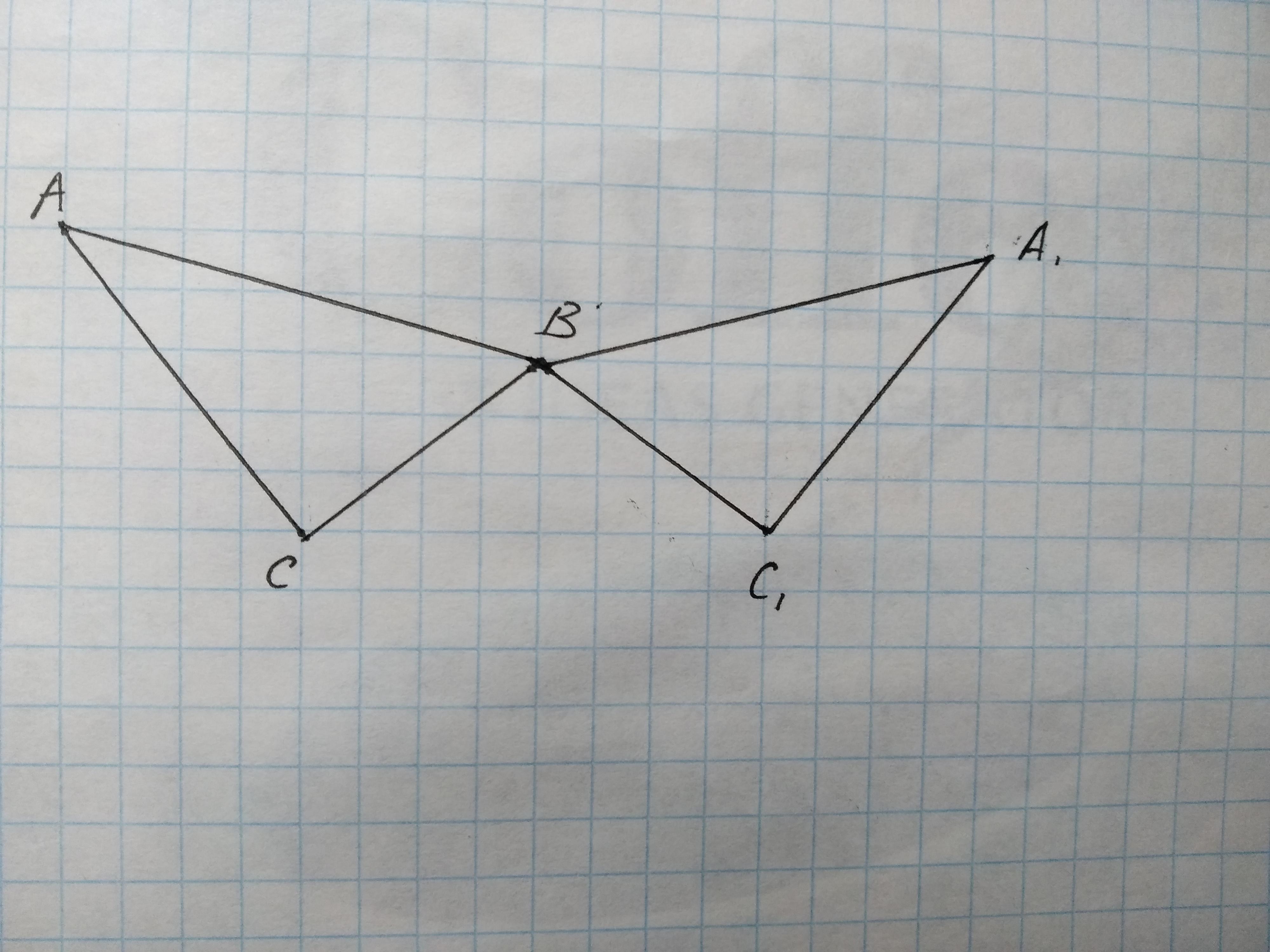 скопируйте треугольник ABC (на фото) и постройте треугольник, симметричный ему относительно вершины B