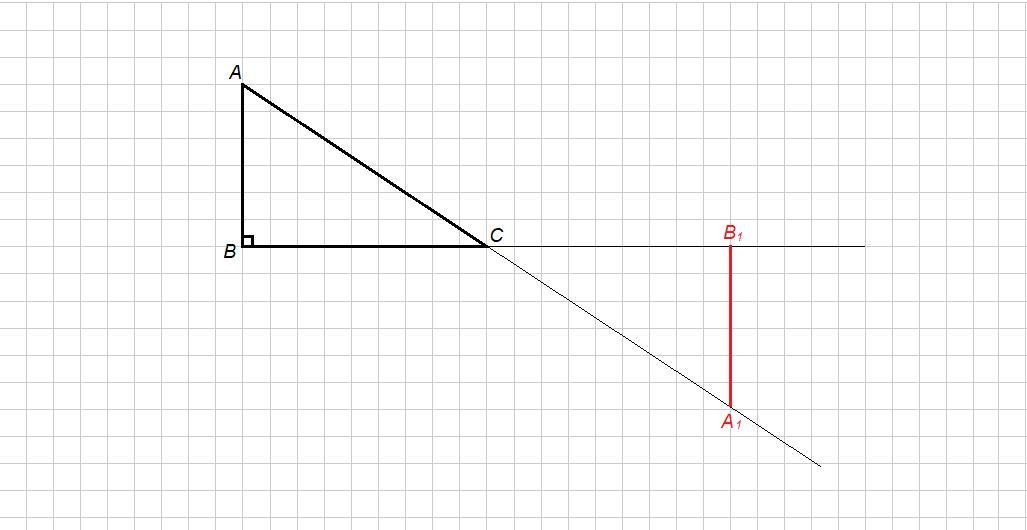 дано прямокутний трикутник ABC з гіпотенузою AC побудуйте відрізок симетричний катету AB відносно точки С