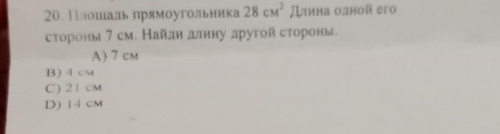 площадь прямоугольника 28 см² . Длина одной его стороны 7 см . Найди длину другой сторон .