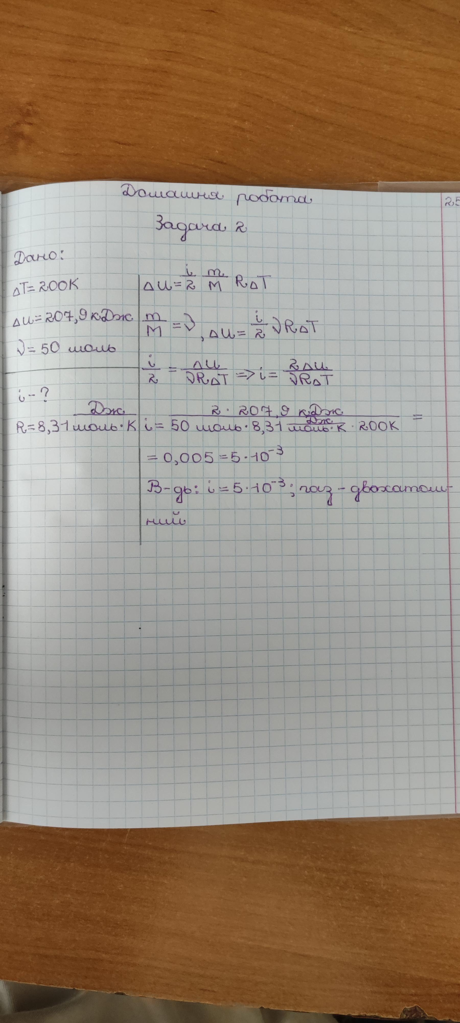 Внутрішня енергія 50 молів ідеального газу при зміні температури на 200К змінилось на 207,9 кДж. Визначити число ступенів вільності газу.