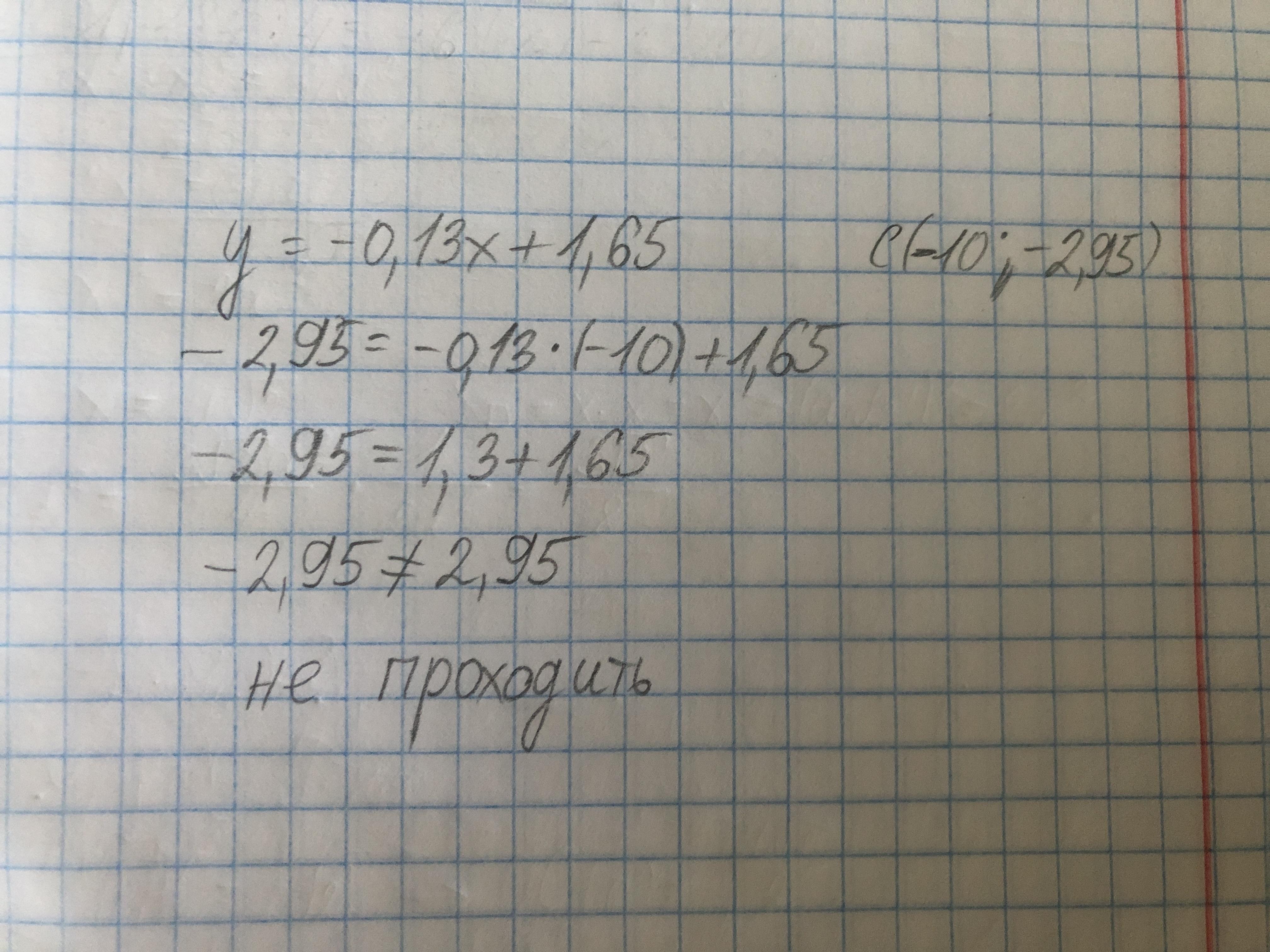 Отсюда мы можем сказать что прямая y=-0,13x+1,65 не проходит через точку c(-10; -2,95).