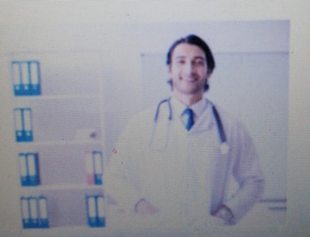 There is a young doctor on the picture. He is smiling. He is wearing a white doctor's apron and has a stethoscope around his neck. At the back there are shelves with black folders on them.