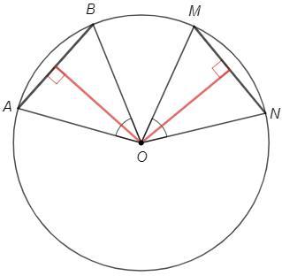 1) Дана окружность. В ней мы взяли две равные хорды AB и MN. Доказать, что расстояние от точки O (центра) до каждой из хорд одинаково