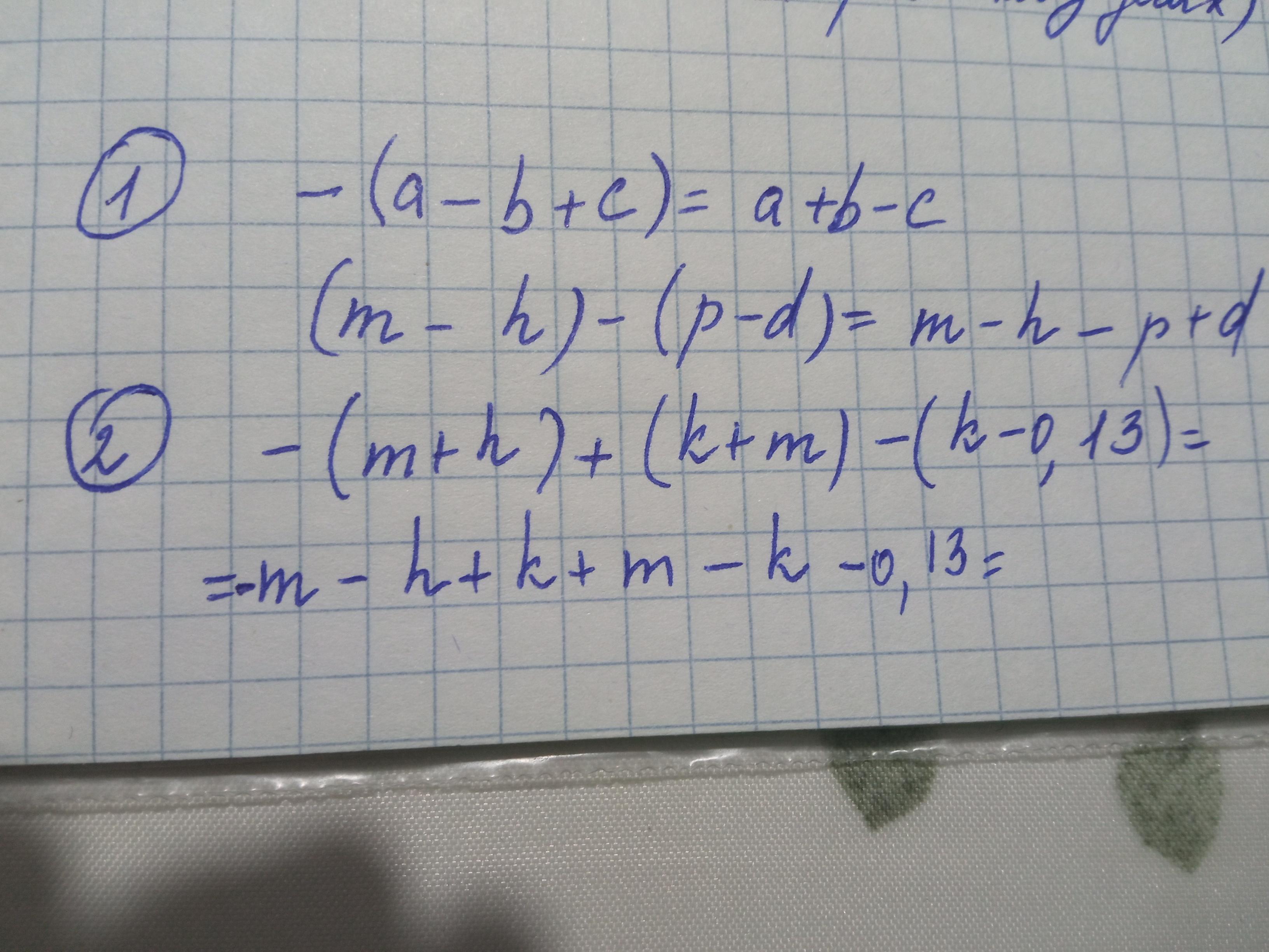 добрый вечер помогите пожалуйста решить два задания,1) раскрыть скобки и упростить -(a-b+c); (m-h)-(p-d) и номер 2) -(m+h)+(k+m)-(k-0,13) если n= -2,13