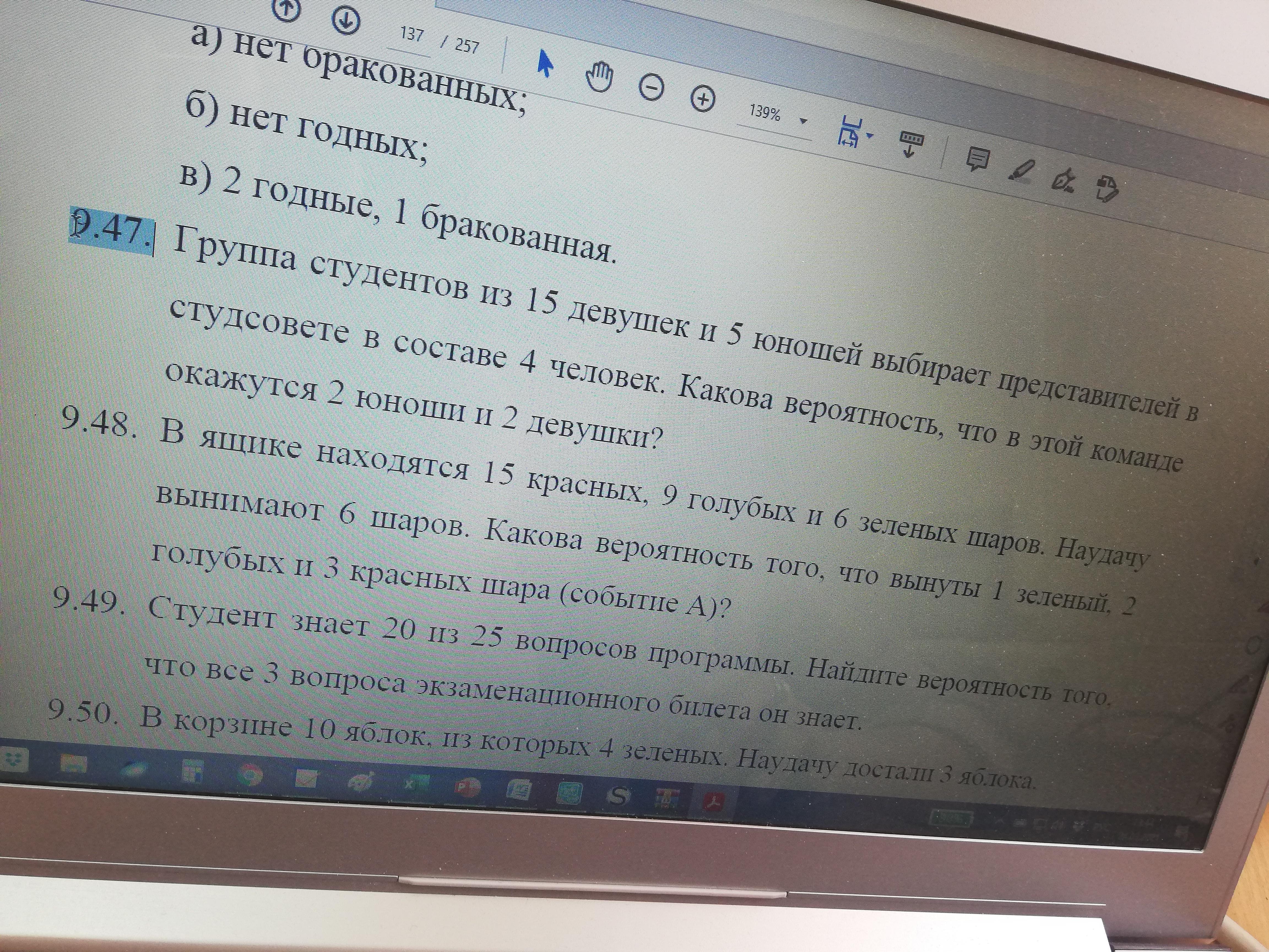 9.47) по формуле комбинезона. дробь: в числителе произведение двух комбинезонов: комбинезон 2 из 15 и комбинезон 2 из 5. в знаменателе комбинезон 4 из 20. (20 так как 15 девочек+5 мальчиков). при вычислении = 70/323