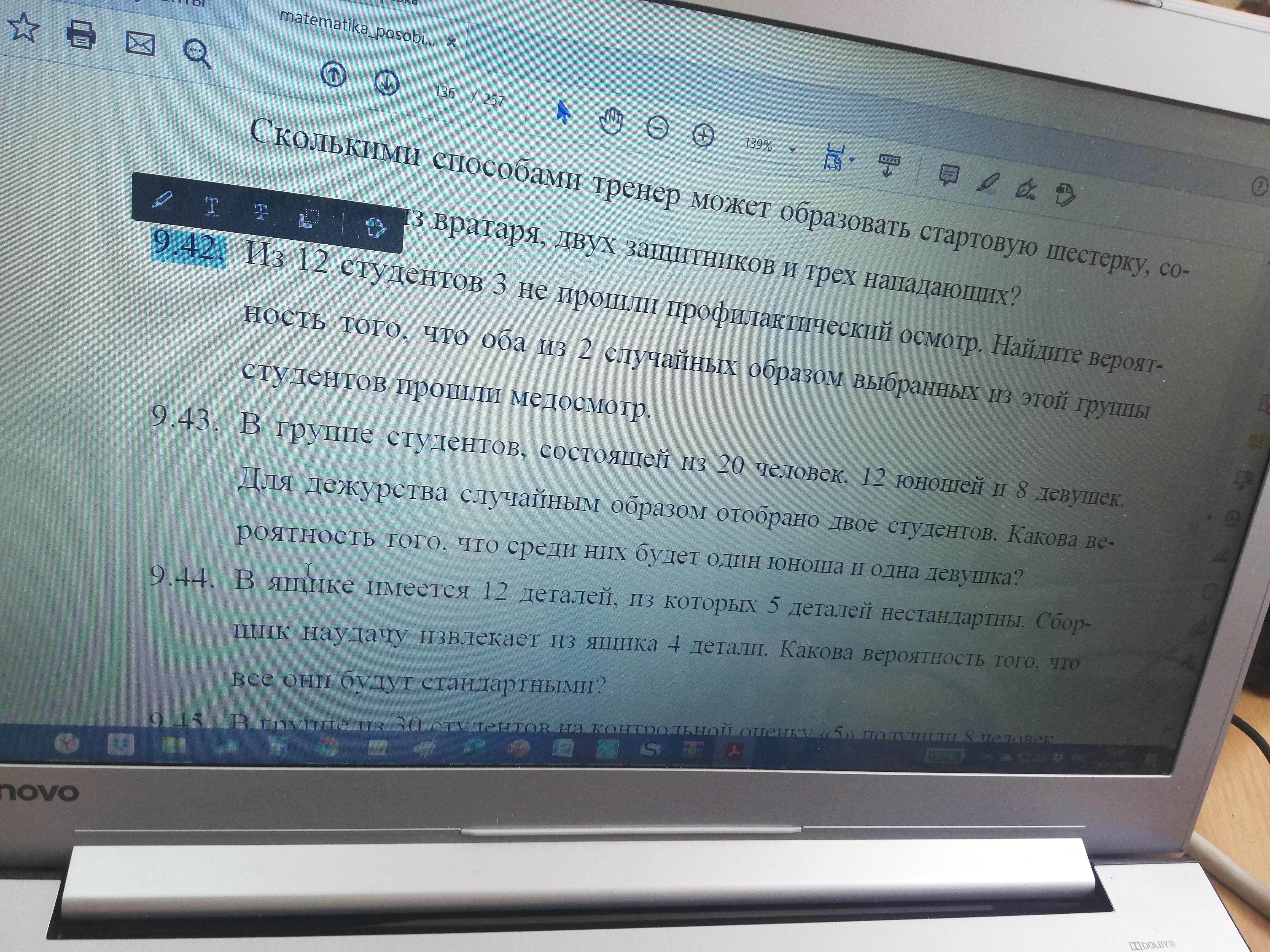 если из 12 осмотр не прошли 3е, значит оставшиеся 9 прошли. из 12ти студентов 1 случайно выбранный осмотренный составляет 9/12 вероятности, а второй случайно выбранный осмотренный составляет 8/11 вероятности, ибо если одного осмотренного из 9ти уже выбрали, значит осталось 8 осмотренных и общее количество студентов так же уменьшилось на 1 и стало 11. теперь, чтобы найти вероятность мы должны перемножить дроби 9/12 и 8/11. при перемножении получаем ответ