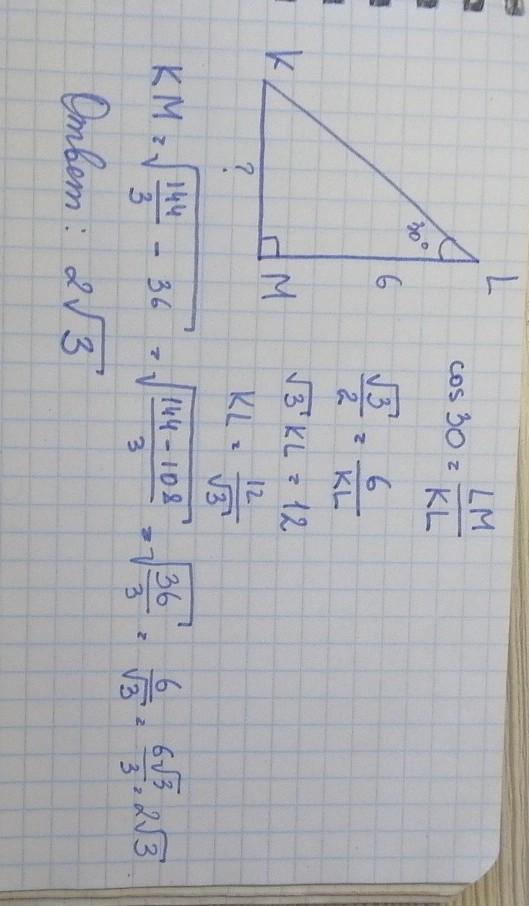 Дан треугольник KLM,угол L=30° ,LM=6.