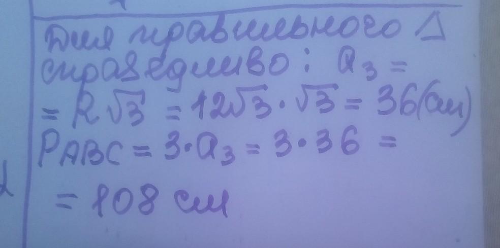Радіус кола, описаного навколо правильного трикутника, дорівнює 12√3 см. Знайдіть периметр трикутника