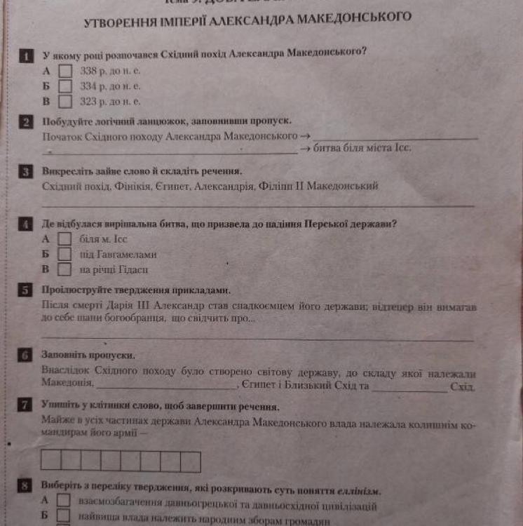 8.Еллінізм — етап в історії країн Східного Середземномор'я який тривав з часу смерті Александра Македонського до завоювання цих країн Римом, що завершився в 30 році до н. е., взаємовплив грецької та місцевих, переважно східних, культур, розширюючи іноді хронологічні рамки етапу еллінізму до початку Середньовіччя.