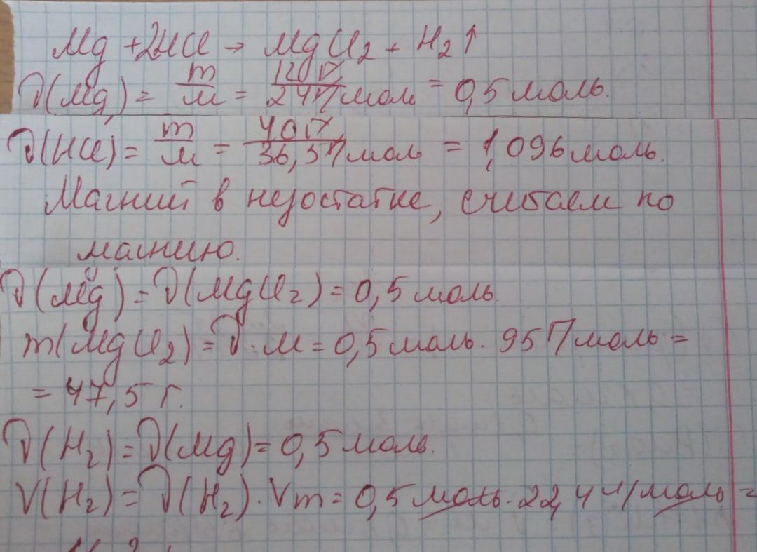 12 г. магнію провзажмодіяли з 40 г хлоридної кислоти знайти масу солі що утворилася і об'єм газу який виділився