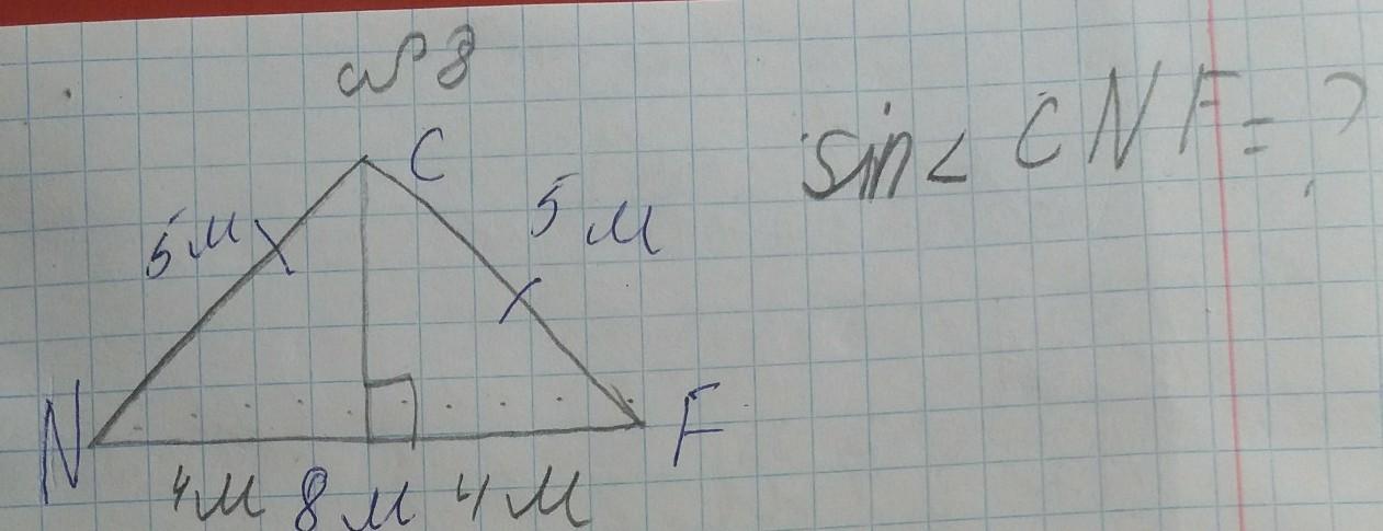 У нас есть равнобедренный треугольник NCF и два равновеликих прямоугольных треугольника NCK CFK, К это основание высоты, опущенной из угла С. Кстати, почему равновеликих, потому что, высота проведенная к основанию является медианой и биссектрисой, следовательно NK=KF , что в принципе вы и отметили по 4, теперь вспомним определение синуса: синус угла - отношение противолежащего катета к гипотенузе, противолежащий катет это CK, длину которого нужно найти, а это очень просто, ведь у нас есть прямогуольный треугольник со сторонами х,4,5. Это египетский треугольник, а значит х=СК=3, ну если не знаем про египетские треугольники, пользуемся теоремой Пифагора: 25-16=9, корень из 9 - 3,следовательно синус этого угла равен 3/5