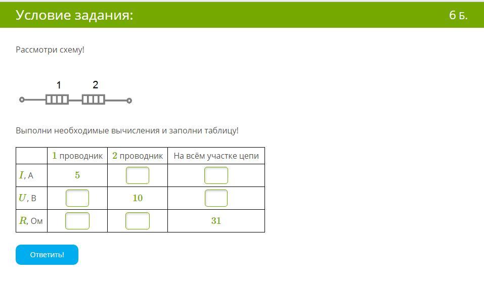 R2=10/5=2 Ом; R1=31-2=29 Ом; U1=29*5=145в