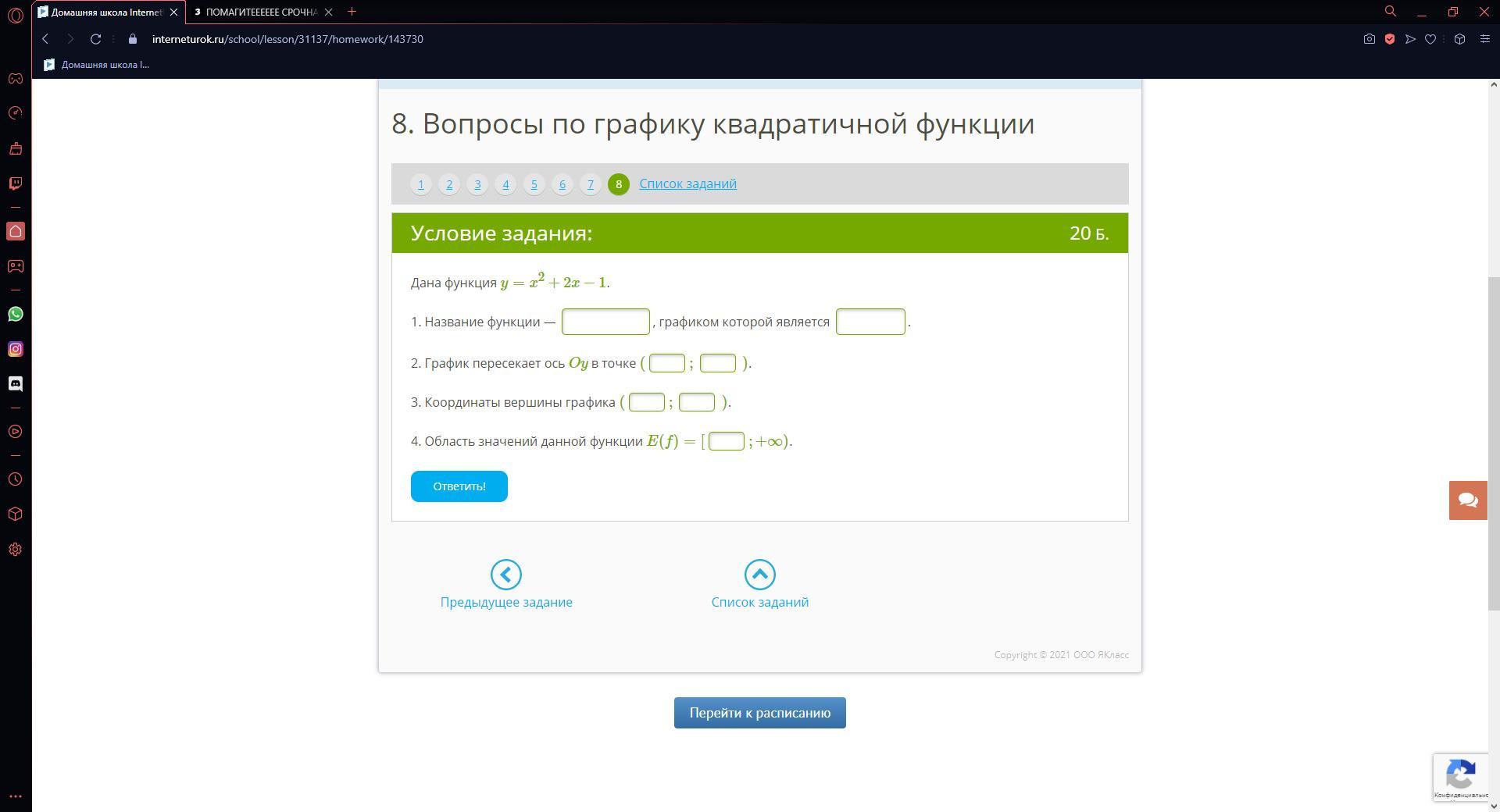 название функции КВАДРАТИЧНАЯ графиком которой являеться ПАРАБОЛА. график пересикает ось Оу в точке (0; -1). координати вершини графика (-1; -2). область значеник (-2; +беск)