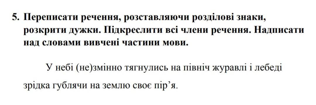 У (прийменник) небі (іменник) незмінно (прислівник) тягнулись (дієслово) на (прийменник) північ (іменник) журавлі (іменник) і (сполучник) лебеді (іменник), зрідка (прислівник) гублячи (дієприслівник) на (прийменник) землю (іменник) своє (займенник) пір"я (іменник).