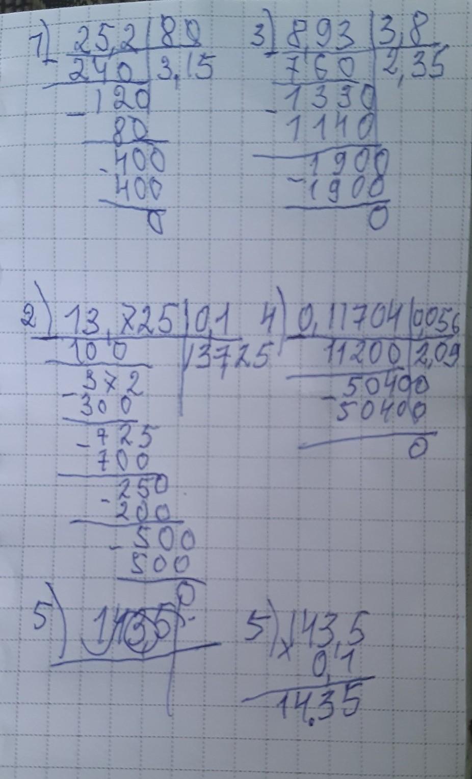 Решите столбиком плиз 1.) 25,2 ∶ 8; 2.) 13,725 : 0,1; 3) 8,93 : 3,8; 4.)0,11704 : 0,056; 5)143,5 ∙ 0,1