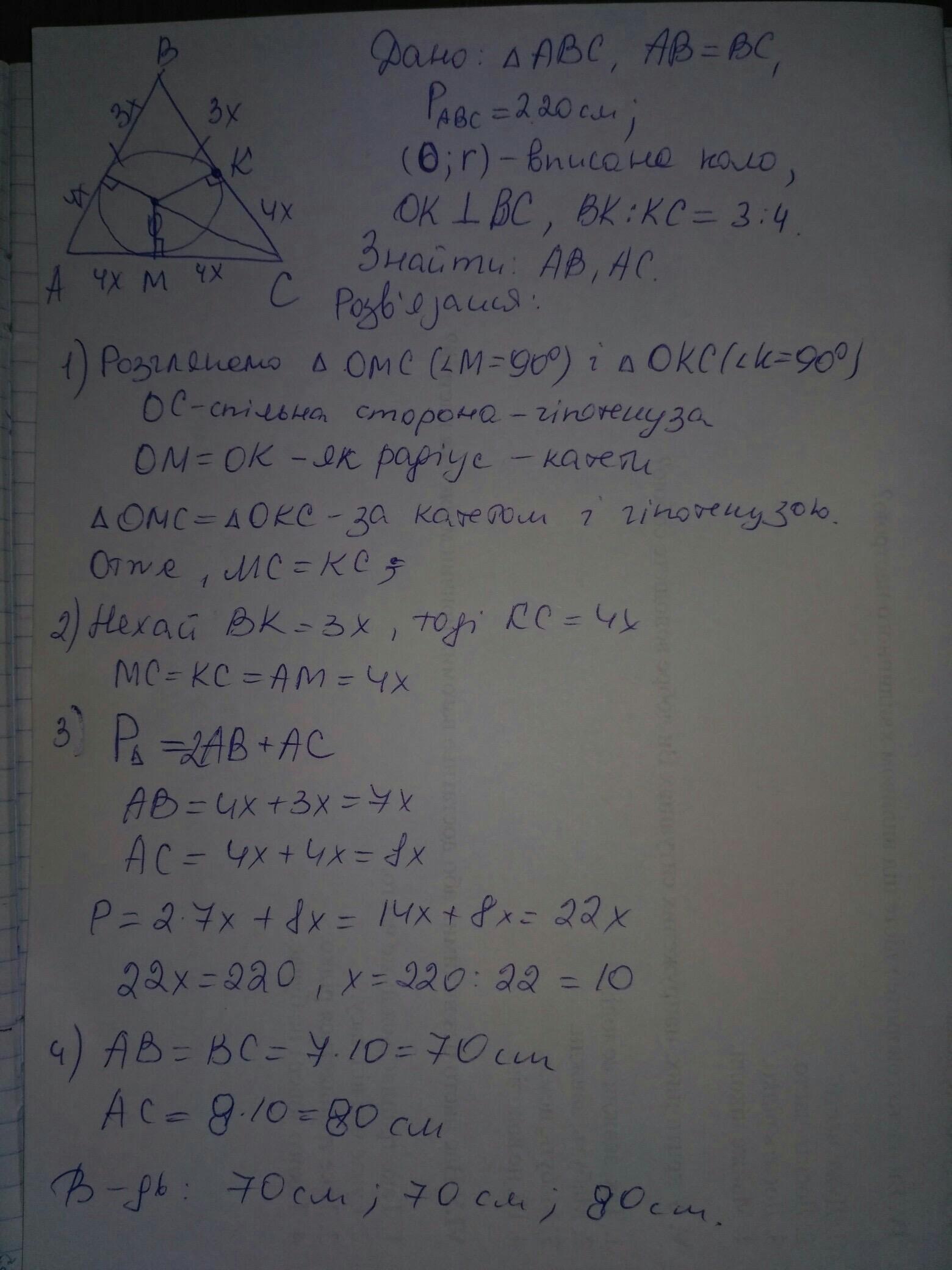 Периметр рівнобедреного трикутника дорівнює 220 см. Точка дотику вписаного кола ділить бічну сторону на відрізки у відношенні 3 : 4. Знайдіть сторони трикутника. Скільки розв’язків має
