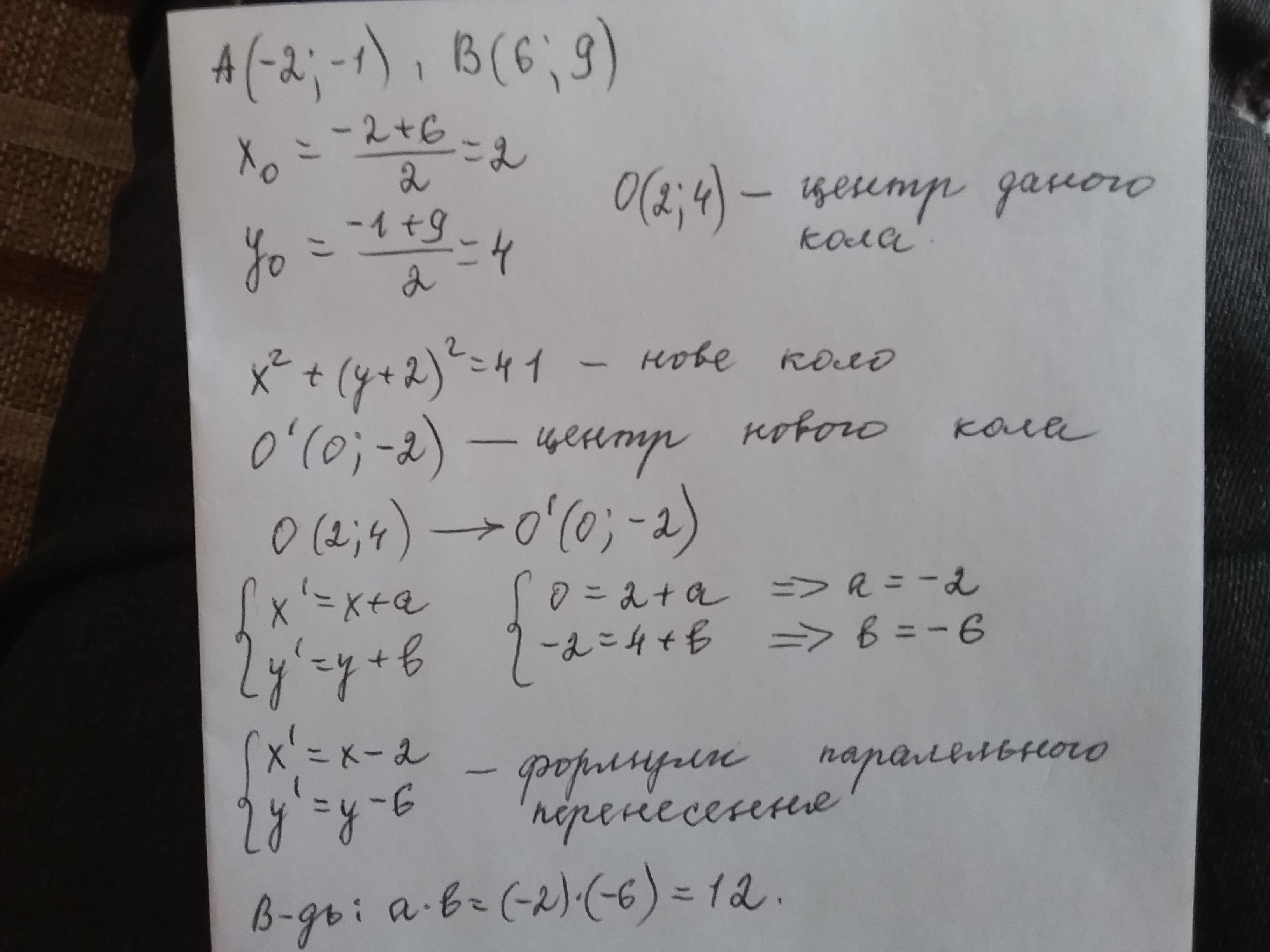 Кінцями діаметра кола є точки (−2; −1) і (6; 9). Складіть формули паралельного перенесення