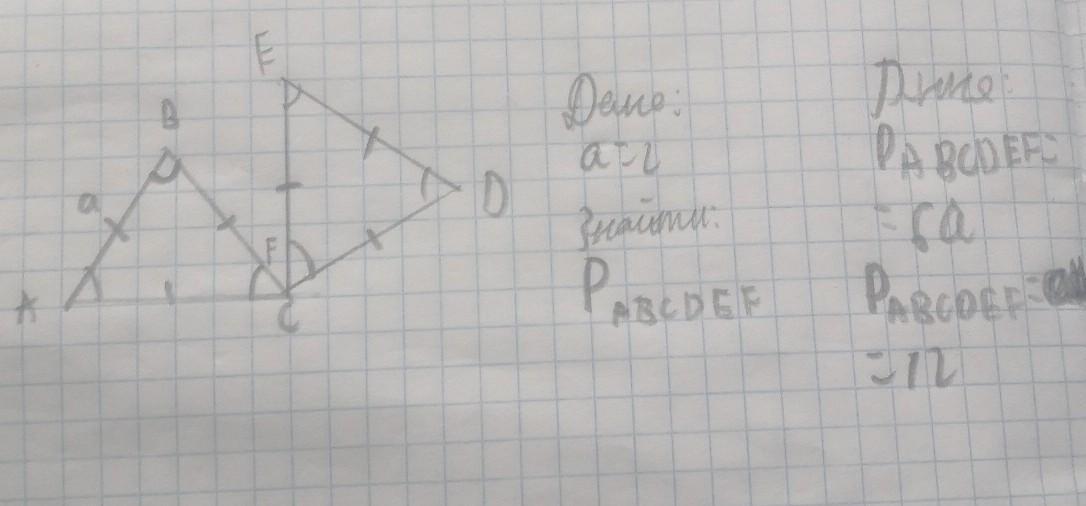 Побудуйте фігуру, в яку переходить рівносторонній трикутник при повороті за годинниковою стрілкою навколо однієї із вершин на кут 90°. Знайдіть периметр периметр фігури, що є об’єднанням обох трикутників, якщо сторона початкового трикутника дорівнює 2