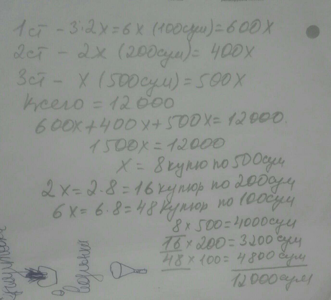 У Аноры было 12000 сум.Она разложила их в три стопки.В первой стопке 100 сумовые банкноты.Во 2-ой стопке 200 сумовые.В третьей стопке 500 сумовые.В первой стопке купюр в 3 раза больше чем во 2-ой стопке.Во второй стопке В 2 раза больше чем в третьей стопке.Сколько банкнот всего