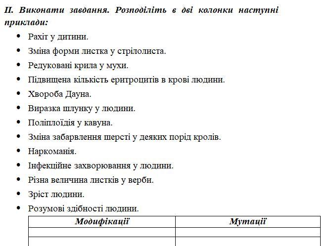 Модификация: рахит, изменение форма листа, увеличение количества эритроцитов, язвенная болезнь, наркомания, инфекционные заболевания, рост человека и мыслительные способности. Остальное относится к мутациям