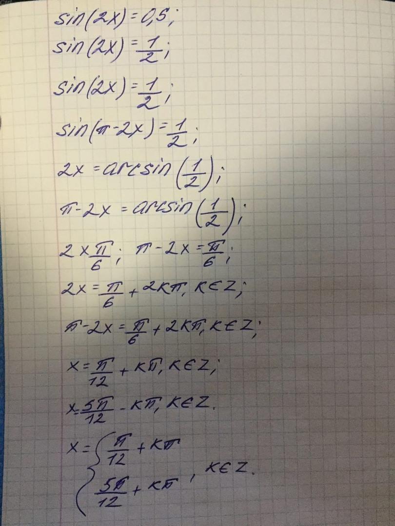 решыте уравнение sin 2x=0,5