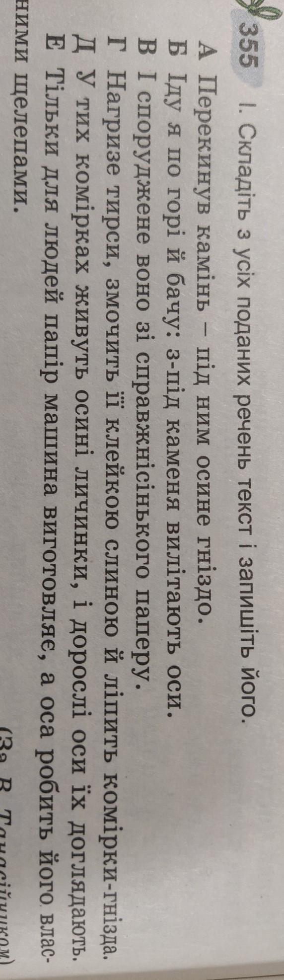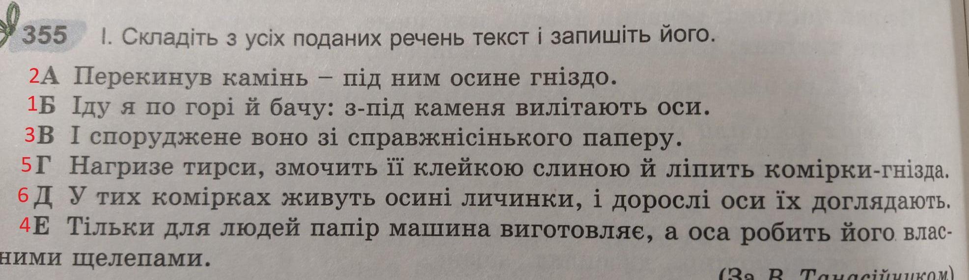 1-Б → Іду я по горі й бачу: з-під каменя вилітають оси. 2-А → Перекинув камінь – під ним осине гніздо. 3-В → І споруджене воно зі справжнісінького паперу. 4-Е → Тільки для людей папір машина виготовляє, а оса робить його власними щелепами. 5-Г → Нагризе тирси, змочить її клейкою слиною й ліпить комірки-гнізда. 6-Д → У тих комірках живуть осині личинки, і дорослі оси їх доглядають.