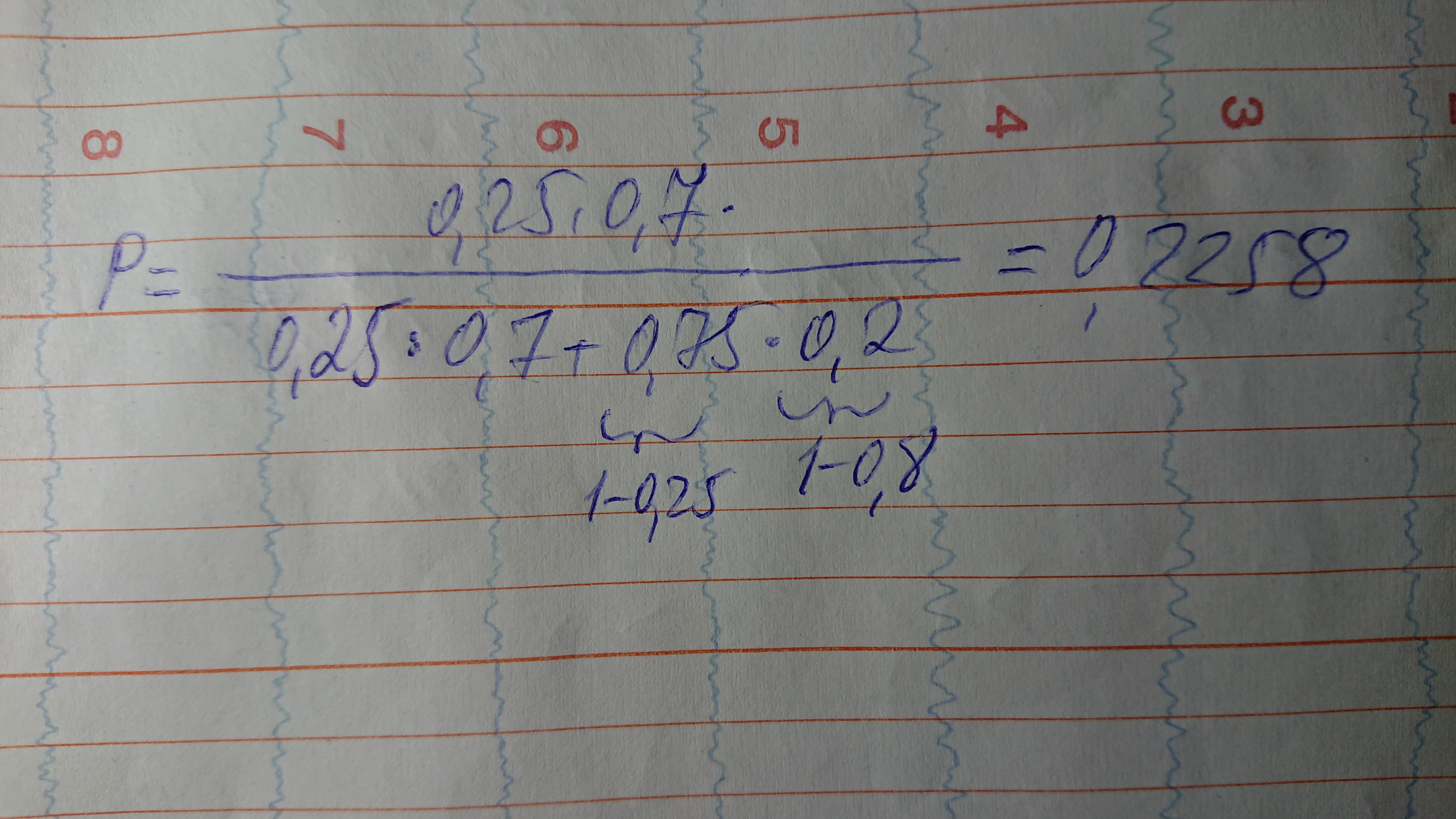 Ответ: 0,2258, решаем по теореме Байеса. См фото.