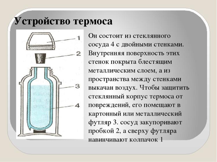Устройство термоса имеет сложную в плане изготовления конструкцию. В его основе лежит колба с двойными стенками, между которыми находится вакуум. Внутренняя часть колбы окрашена серебристой краской, поэтому имеет зеркальный эффект. Сверху она окружена защитным корпусом, а между ними заложен слой утеплителя. На колбу накручивается плотная крышка. В некоторых моделях используется дополнительная крышка на внешнем корпусе.