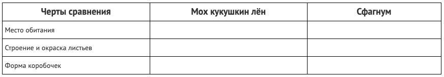[ Задание 3 {М-место обитание С-строение окраска листов Ф-форма коробочек } { я не буду долго печатать так вот МОХ-мох кукушкин лён СФ-сфагнум }