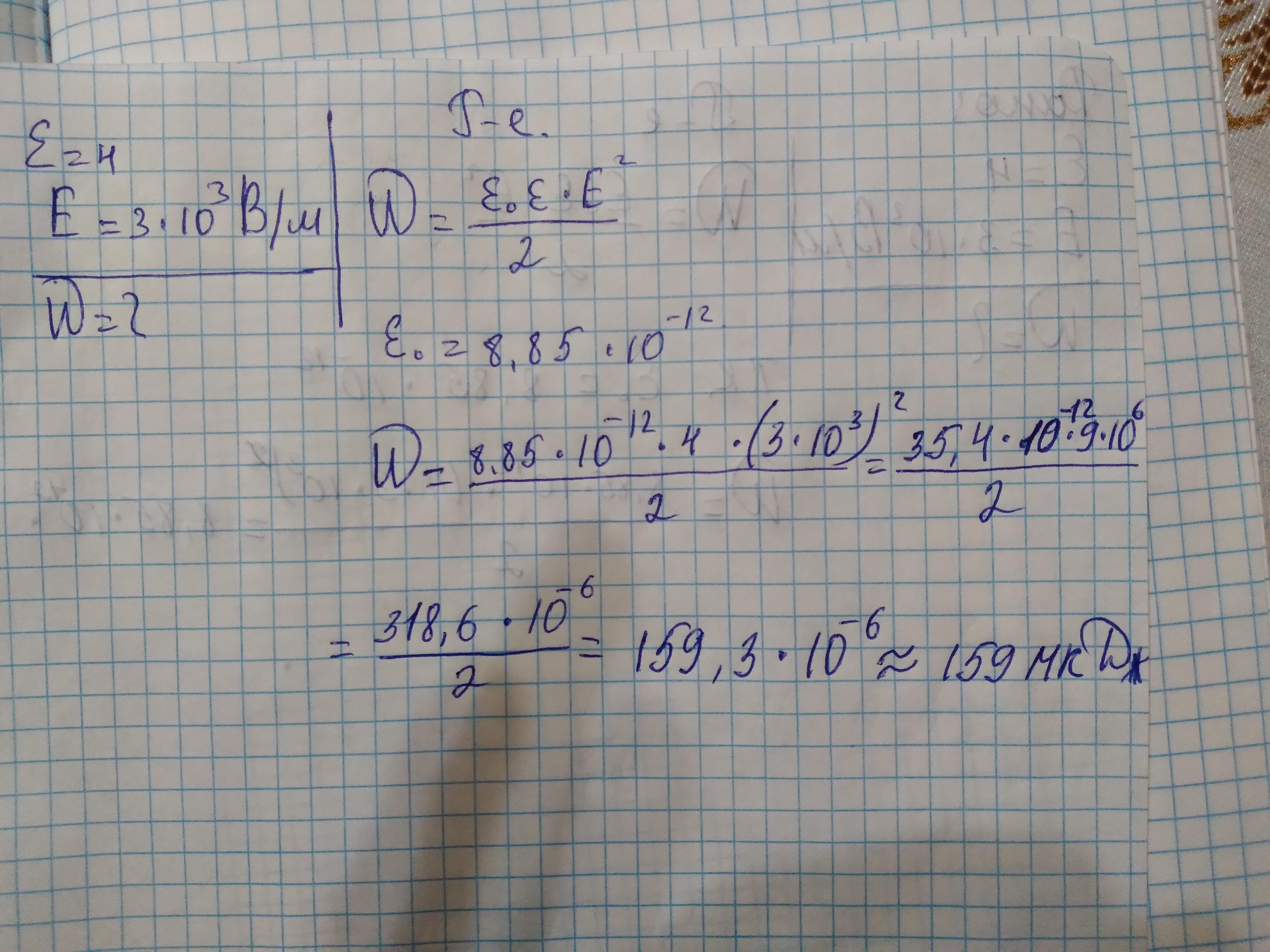 Найдите плотность энергии электрического поля в точке где электрическое восприимчивость равна 4 напряженность равна 3*10³ В/м (ответ:159uДж/м³
