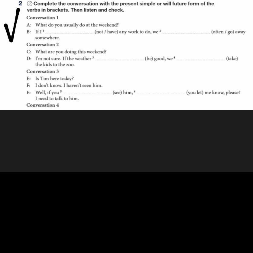 Complete the conversation with the present simple or will future form of the verbs in brackets. Then listen and check.