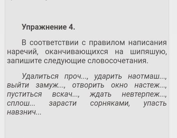 Удалиться прочь, ударить наотмашь, выйти замуж, отворить окно настежь, пуститься вскачь, ждать невтерпёж, сплошь зарасти сорняками, упасть навзничь.