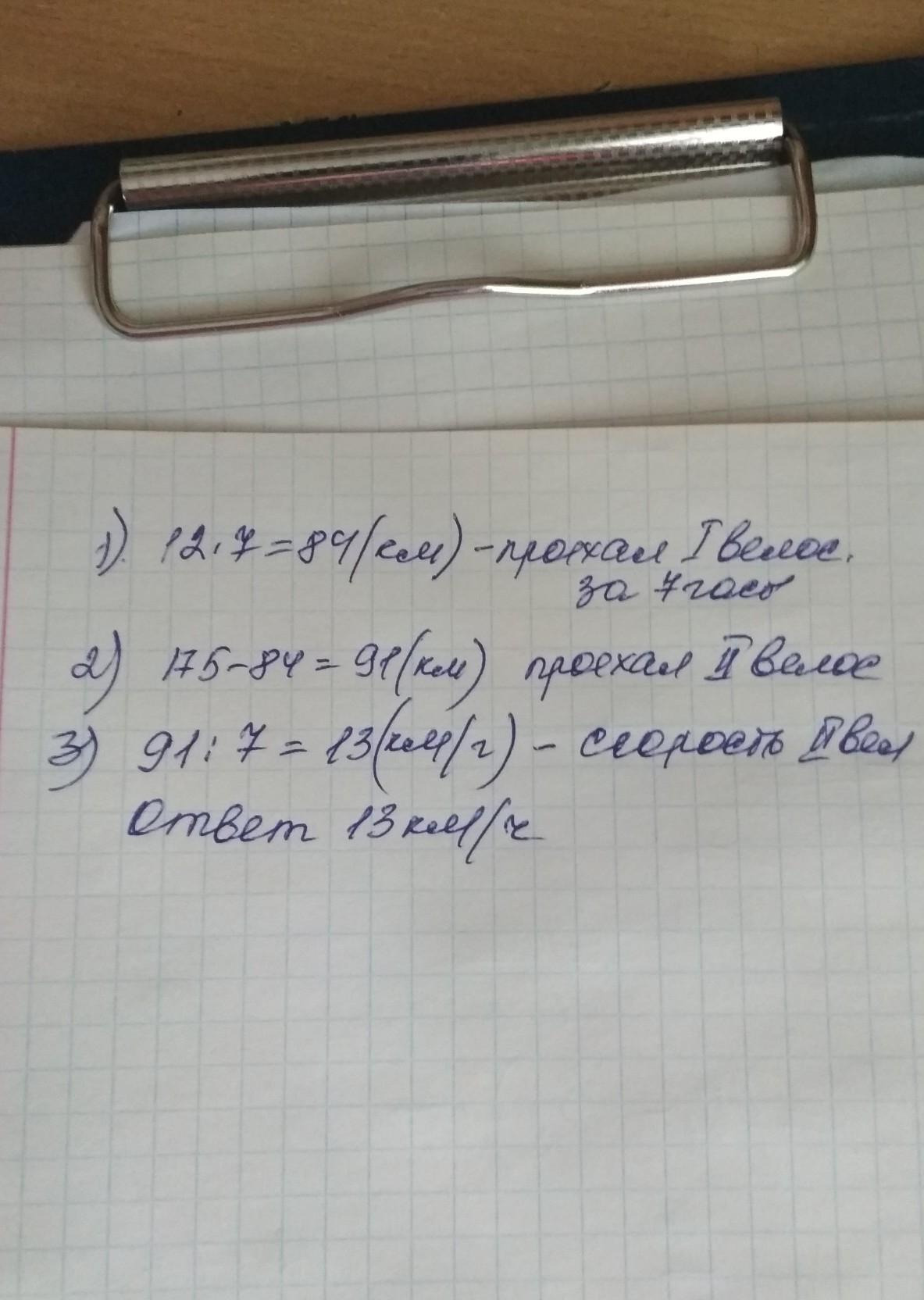 Расстояние между двумя посёлками 175 км/ч Из них одновременно выехали два велосипедиста и встретились через 7 часов скорость одного велосипедиста 12км/ч с какой скоростью ехал второй велосипедист
