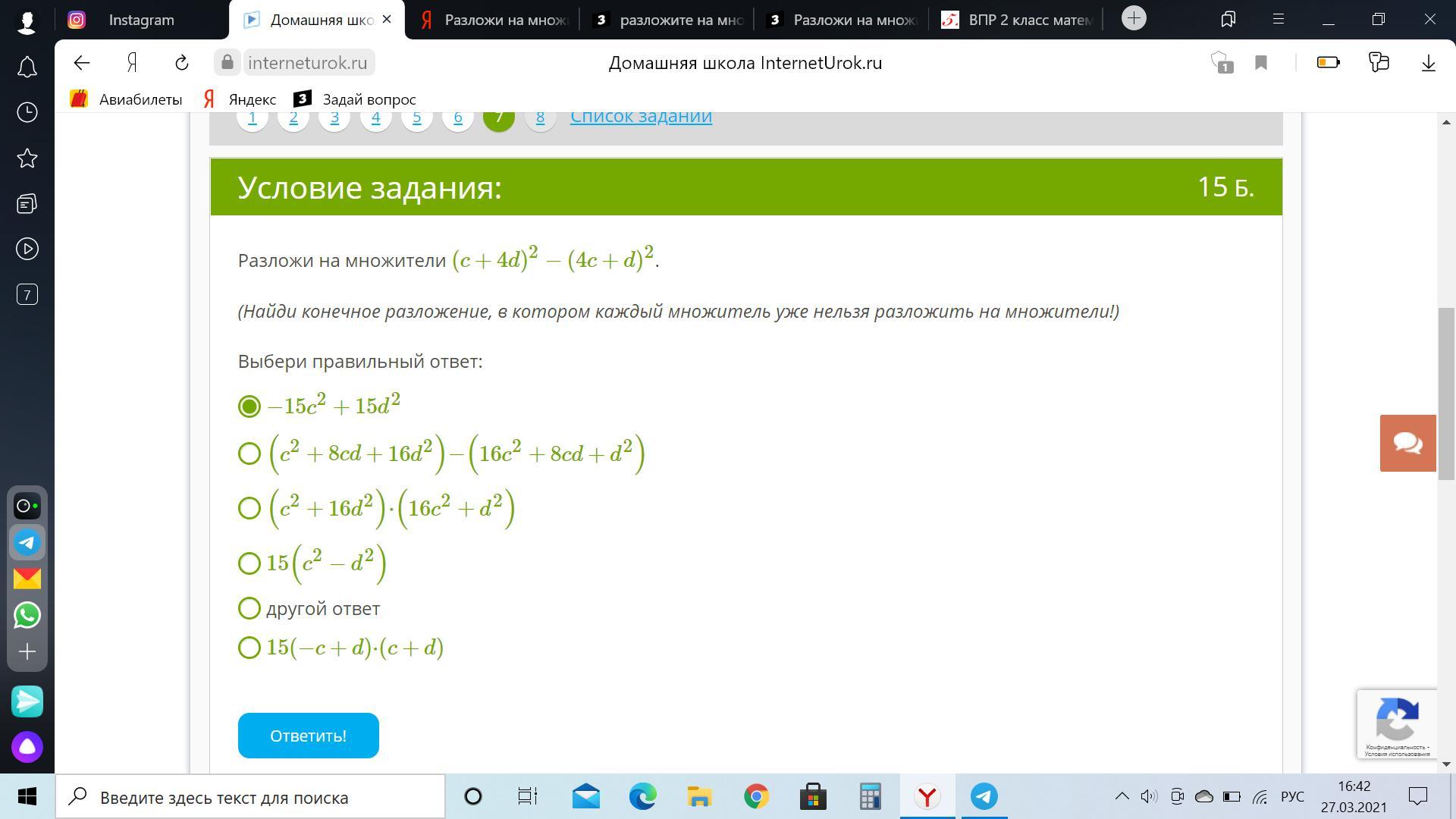 Разложи на множители (c+4d)2−(4c+d)2.