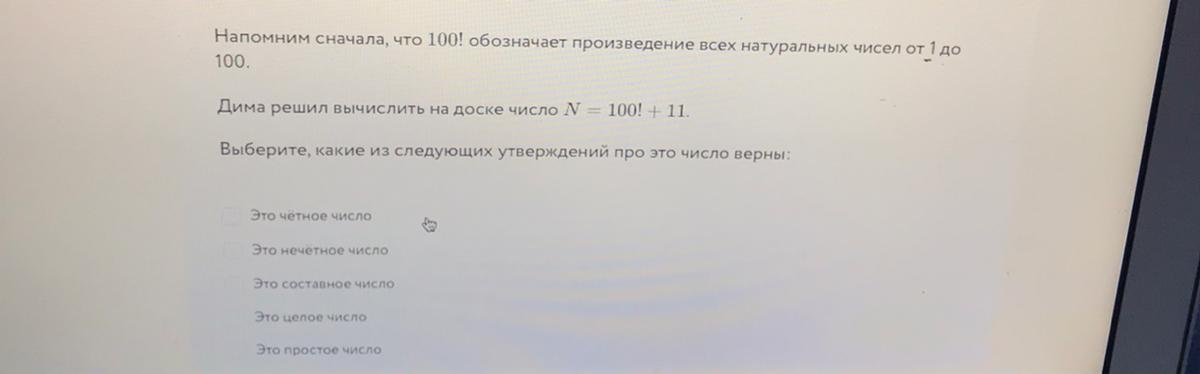 Дима решил вычислить на доске число N=100!+11. Выберите, какие из следующий утверждений про это число верны: 1)это чётное число 2)это не чётное число 3)это составное число 5) это простое число