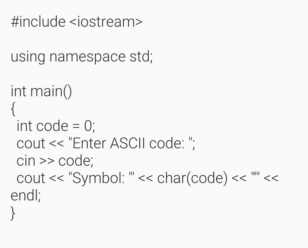 Считайте со стандартного ввода целое число и выведите ASCII-символ с таким кодом. Решите эту задачу с использованием только одной переменной типа int.