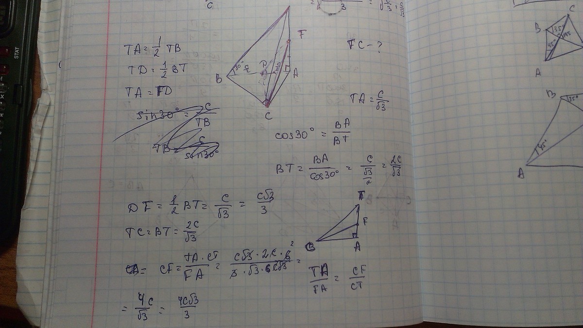 1)Основанием пирамиды TABC является прямоугольный треугольник ABC с гипотенузой AB, равной c. Боковое ребро TA - высота пирамиды, боковое ребро TB образует с плоскостью основания угол в 30 градусов, а с медианой основания CD угол 60 градусов. Найдите расстояние между прямыми TB и CD.