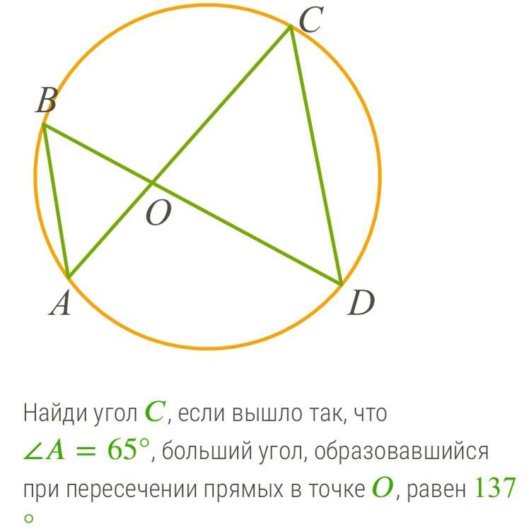 Найди угол , если вышло так, что ∠=65°, больший угол, образовавшийся при пересечении прямых в точке , равен 137°.