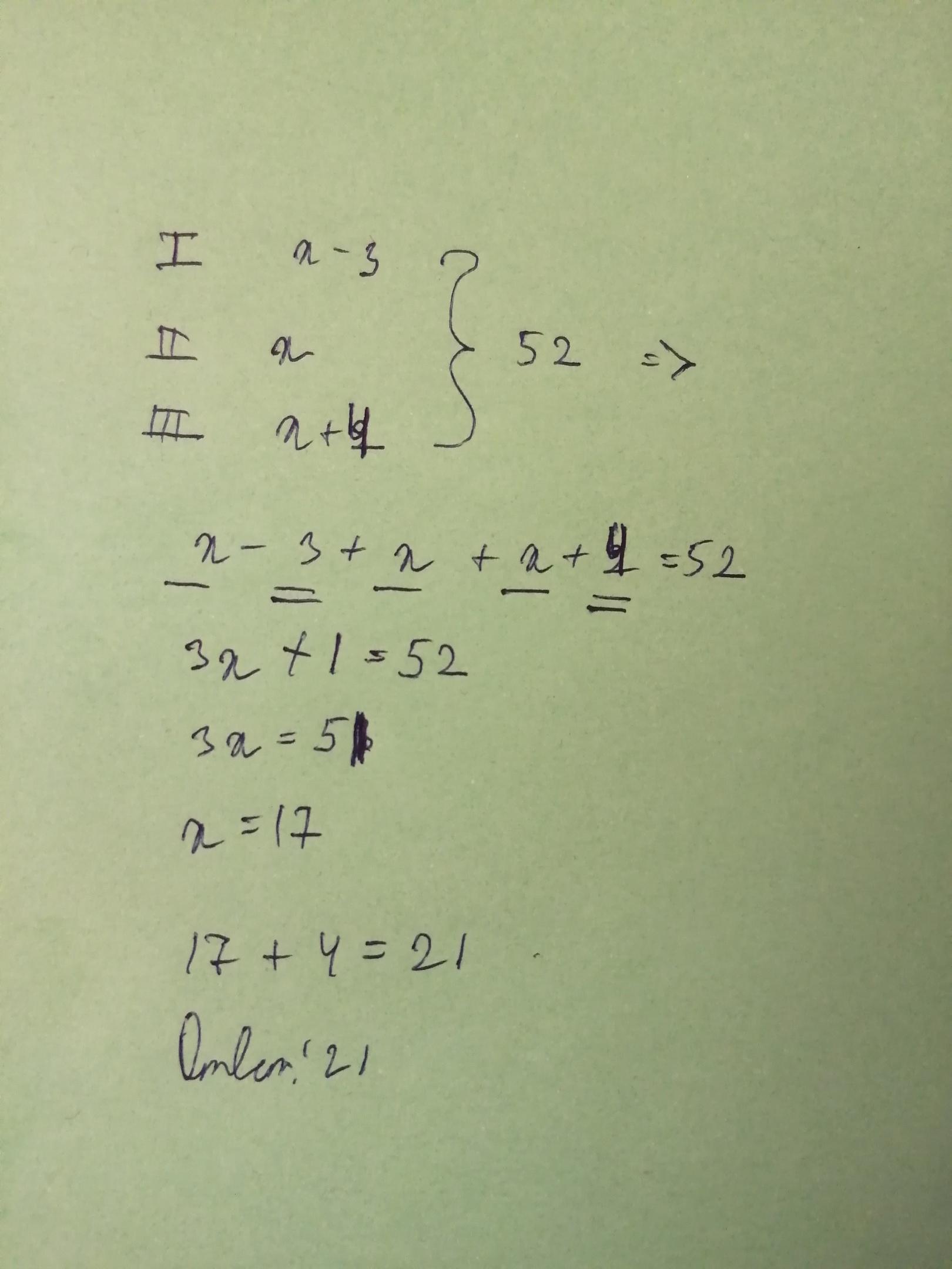 52 книги расставили по трём полкам, причём на первой полке оказалось на 3 книги меньше, чем на второй, а на третьей – на 4 больше, чем на второй. Сколько книг стоит на третьей полке?