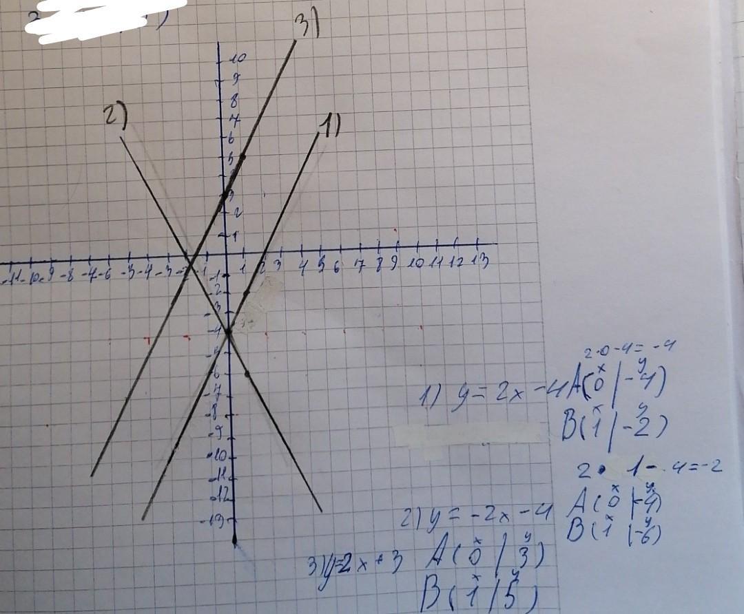 График 1) пересекается Ox в (2 | 0), а Oy в (0 | - 4)