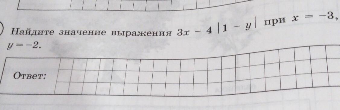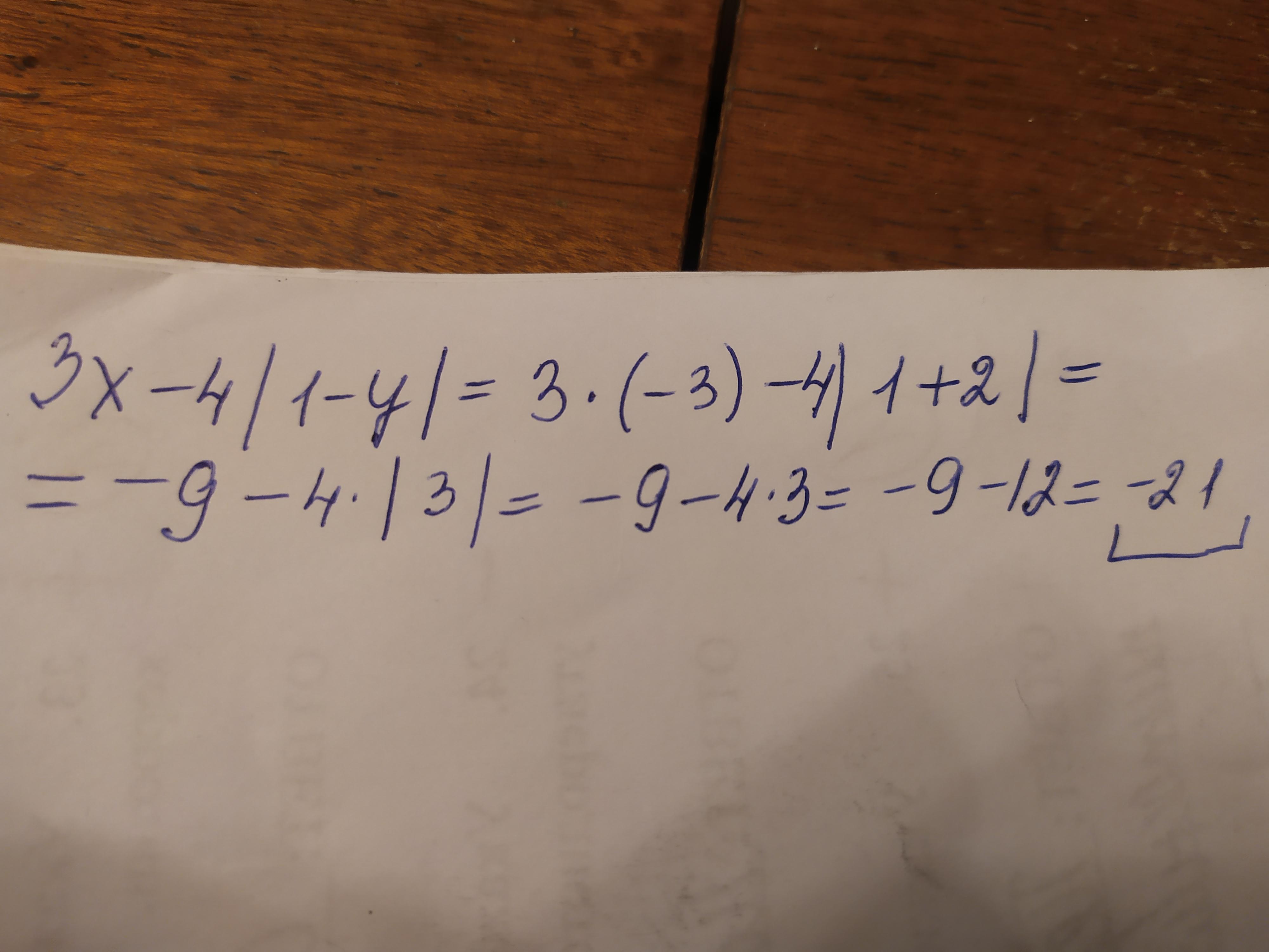 3x - 4|1 - y| = 3 * (-3) - 4| 1 -( - 2)| = - 9 - 12 = -21