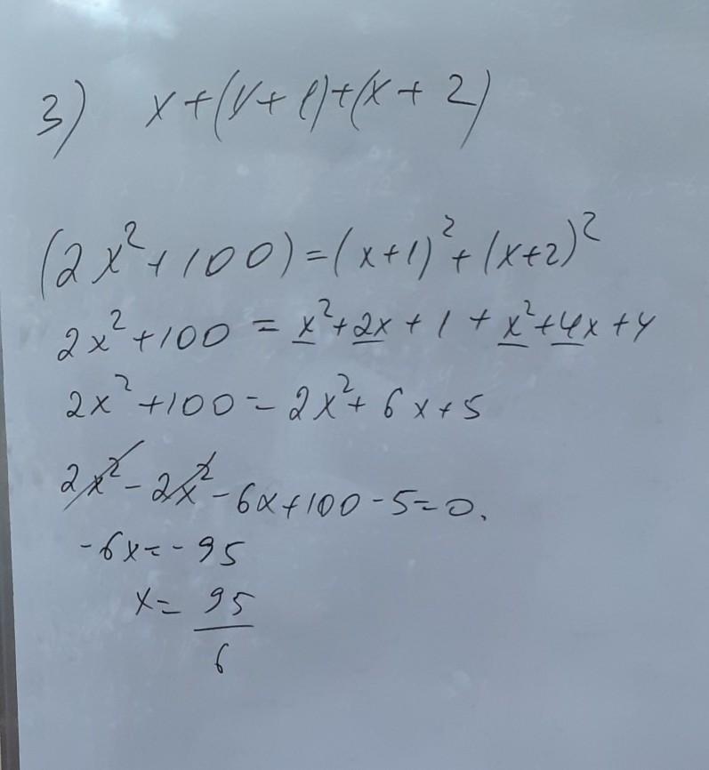 3) Найдите три последовательных целых числа, если удвоенный квадрат меньшего из них, на 100 меньше суммы квадратов двух других чисел.