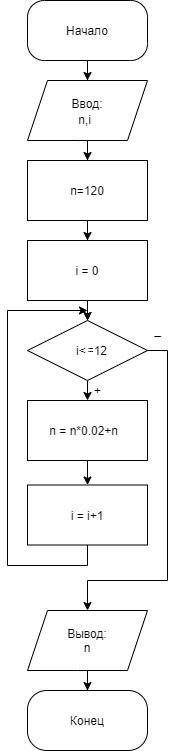 Составить блок-схему и написать на алгоритмическом языке. Рост ребенка на начало года — 120 см. За месяц он подрастает на 2%. Каков будет рост ребенка через год?